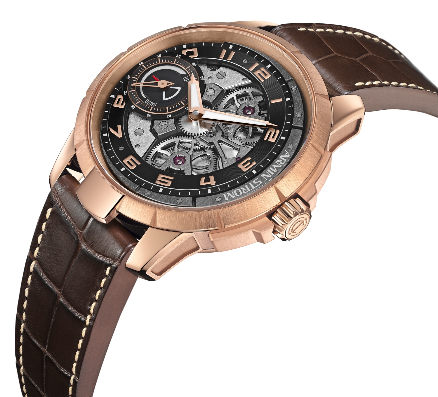 RG16-EB.5N EDGE DOUBLE BARREL ROSE GOLD Manufakturwerk ARMIN STROM Kaliber ARM16 Handaufzug, Doppelfederhaus, 8-Tage Gangreserve, kleine Sekunde, dezentrierte Zeitindikationen Frequenz: 18’000 A/h Rubine: 34 Anzahl Einzelteile: 194 Für mehr Info bez. Kaliber, siehe letzte Seite Gehäuse 18ct Roségold Glas und Gehäuseboden aus antireflexbeschichtetem Saphirglas Durchmesser: 46.80mm Höhe: 13.20mm Wasserdicht bis: 50m Zifferblatt-Ring Schwarz mit weissen Indexen und roségoldenen Ziffern Zeiger Roségold Armbänder Ausgeliefert mit braunem Alligator-Lederband und Dornschliesse in 18ct Roségold sowie zusätzlichem Kautschukband in braun. Doppelfaltschliesse in 18ct Roségold ist optional erhältlich. Auflage Limitiert auf 100 Stück Verkaufspreis CHF 39‘900.–